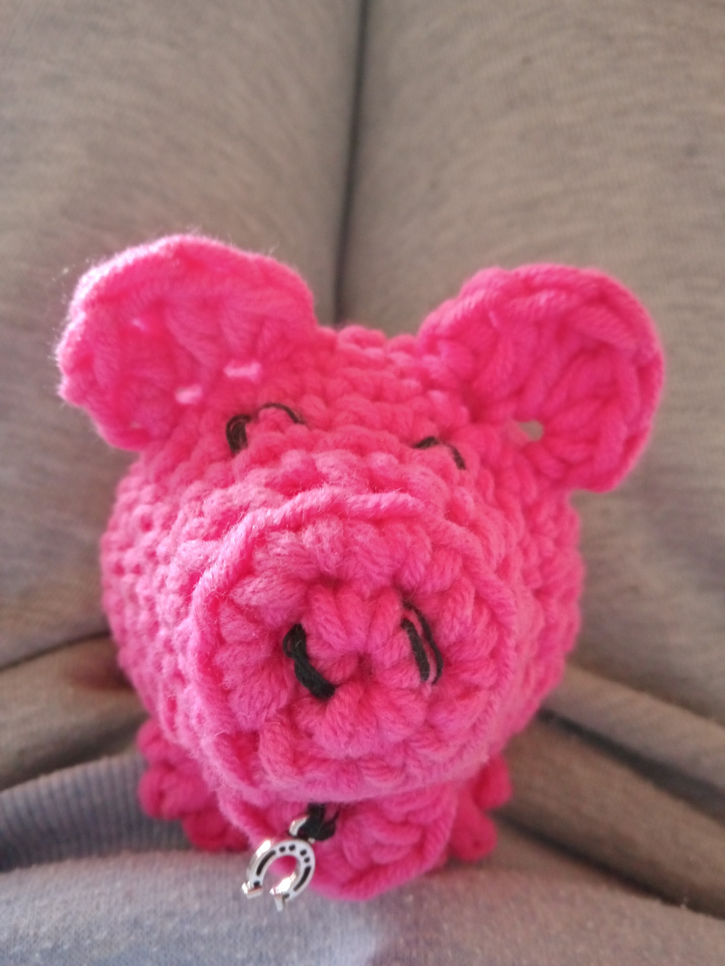 Ringelschwänzla: 6 Lftm., ab 2.M. zurück häkeln: 5x je 2 fM. in 1 M., 1 fM., Kettm. am Schweinla.